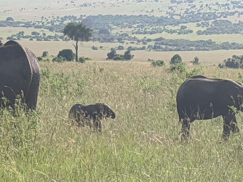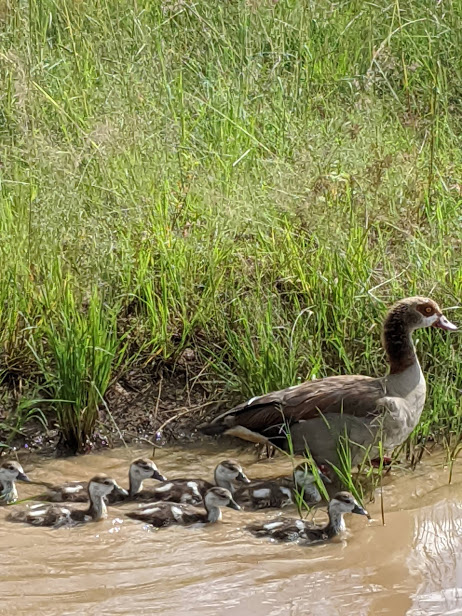 On our way, it started raining. Hard. Again, this is dry season. This was the first time I had seen climate change face-to-face. Every single person from Kenya was talking about how they “never see rain” in December. They were all telling us how worried they were. Almost instantly, the dirt roads liquidized. We came up to several people who were stuck. We also got stuck. I will say, our driver was excellent with that two-wheel drive! While we were all stuck, we saw some hippos in a pond nearby. We also saw some Egyptian Geese with babies. We all were wondering if we may spend the night there as about eight vans were stuck in the deep mud. Luckily, we made it out after about an hour.