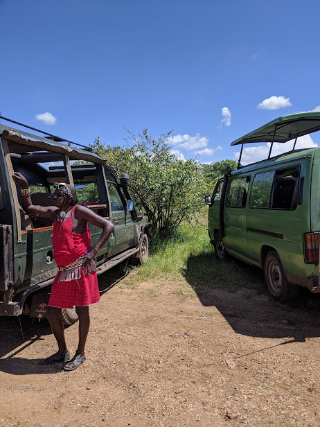 There is an air strip in the middle of the Mara. We stopped here to use the facilities and look at some curios. By the way, I paid double for a tiny giraffe carving than I should have. The Masai people were there selling them. I also got stuck in my bathroom. I had to scream to Austin to help me get out by pushing the handle, as there was no handle to pull the door from inside. After all that fun, it was onward!