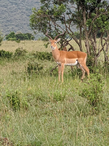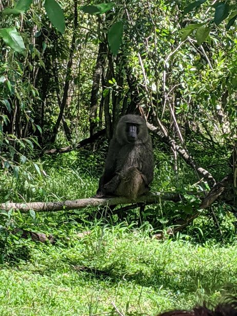 After our walk, it was time for lunch. We had a small, picnic lunch with our van mates. By now, we were getting to be on a name-calling basis with everyone. The 2-year-old, named Precious, was befriending me. We nibbled on a sandwich which entailed a tiny amount of butter and one slice of cucumber. We also had some chicken in foil that had not been refrigerated since we left our accommodations. Suddenly, some monkeys started joining us. One took a banana. They were cute, but our driver scared them off as more started pouring into our bagged lunch. Suddenly, I saw the biggest baboon I had ever seen in my life. He had to be about four feet tall. Now, this, I knew not to mess with. Our driver scared him away with a stick. He kept reappearing from the bush to scare us. However, he minded his own business, except for an empty bag he swiped. I had to tinkle in the woods right where he was earlier. I thought about how I was extremely vulnerable to an attack. I lived.